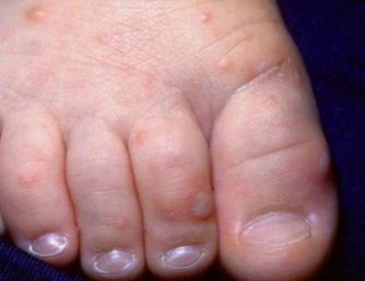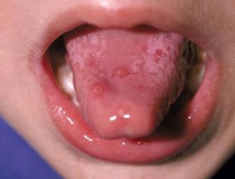 皮疹特点:皮疹开始为斑疹,逐渐进展为水疱,水疱破裂形成浅表溃疡,且通常累及双手、双足、臀部(特别是在婴儿及幼儿中)及四肢。口腔病损为痛性,可能妨碍经口摄食(图11、图12)。皮肤病损为非瘙痒性且无触痛(图13)。