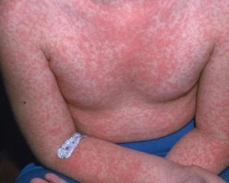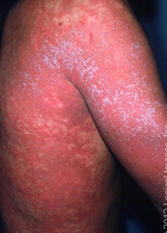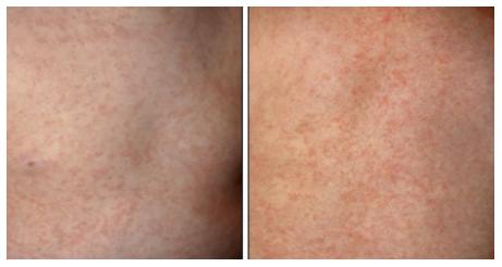 皮疹特点:皮肤弥漫性充血,按压时变白,伴有密集针尖样(1-2mm)隆起,使皮肤表面呈“砂纸”样(图6)。