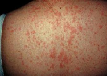 皮疹特点:高热3-5天热退疹出。红色细小密集斑丘疹(见图3),头面颈及躯干部多见,四肢较少,一天出齐,次日即开始消退。