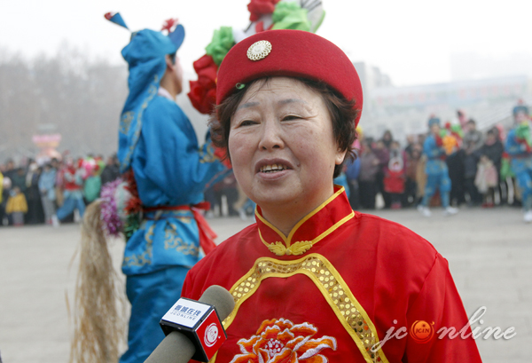 焦女士说,我们来自西上庄冯匠村,表演的节目是大头娃娃和扭秧歌,我参加这种演出有四、五个年头了,希望能给群众们带来欢乐和节日的喜庆。