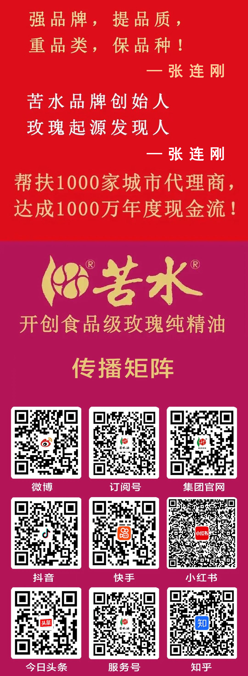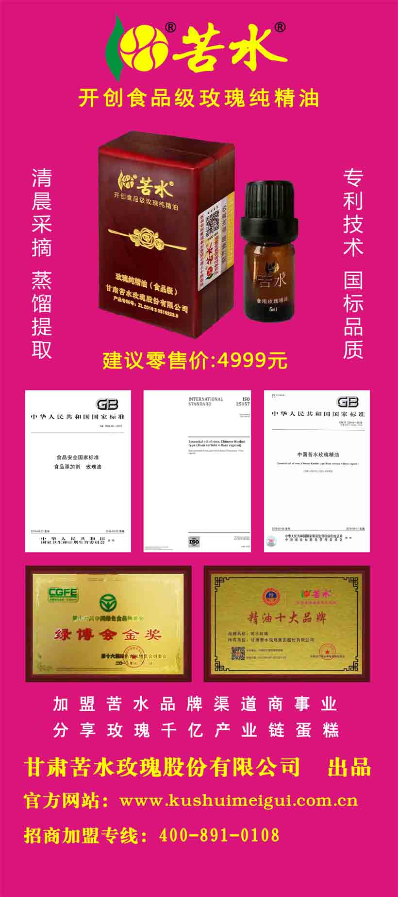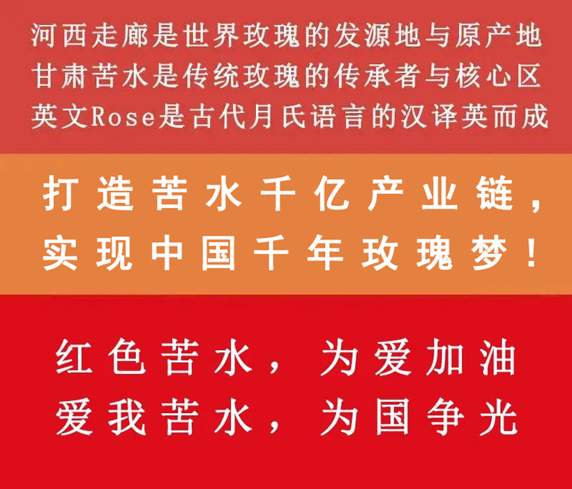 目前,甘肃苦水已开发研制玫瑰纯精油、玫瑰花茶、玫瑰香水、玫瑰酒、玫瑰养生、化妆品等六大系列180多种产品,成立玫瑰产品专卖店15家,实现了网上销售。苦水玫瑰产品畅销北京、上海等一线城市,部分产品出口到澳大利亚、法国、美国等国家。2013年,苦水玫瑰精油获得国际质量认定,从而使苦水玫瑰走向世界。与苦水玫瑰相生相伴发展起来的民间文化历史悠久、丰富多彩,主要有以猪驮山、渗金佛祖、母子宫为主的佛教文化,以苦水高高跷(国家级非物质文化遗产)、太平鼓、木偶戏、下二调(市级非物质文化遗产)为主的民俗文化和以玫海观光、梨园风情、丹霞地貌为主的旅游文化等,形成了一条极具特色的产业发展道路。苦水玫瑰因其与生俱来的浪漫、时尚、包容、开放的特质,成为永登乃至甘肃对外开放的特色品牌,展示出开放发展、与时俱进的永登新形象。美丽的玫瑰流淌希望的馨香,希望的永登散发创新的芬芳。永登县大力培育集科研、综合加工为一体的苦水玫瑰高端商品综合加工项目,涵盖玫瑰多元文化元素的苦水玫瑰浪漫特色小镇项目,大型玫瑰文化主题公园项目等,做好玫瑰文化、玫瑰种植、玫瑰生态、玫瑰加工四篇文章,大力发展文化旅游业和高端玫瑰香料产业,把永登打造成国际知名的“浪漫玫瑰之都”,实现玫瑰产业转型跨越发展。