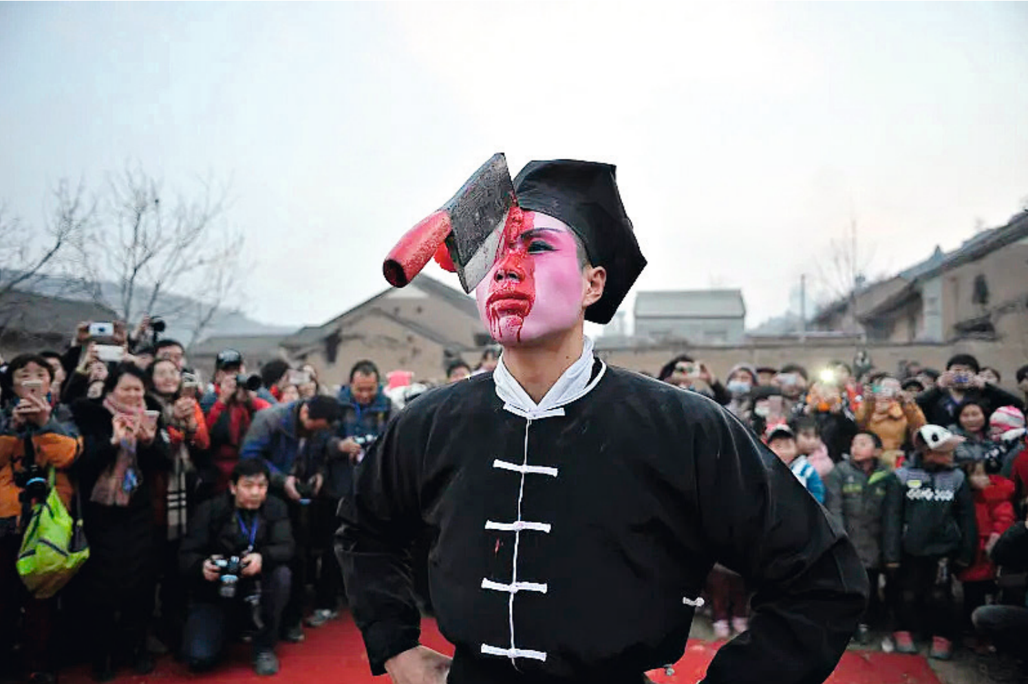 陇县“血社火”表演,演员将剪刀、斧子、锥子、菜刀等固定于头部,形成类似创伤流血的恐怖场面。 许多民俗学家认为,这是一千年前活跃于陆上丝绸之路的中亚粟特人带入中国的风俗
