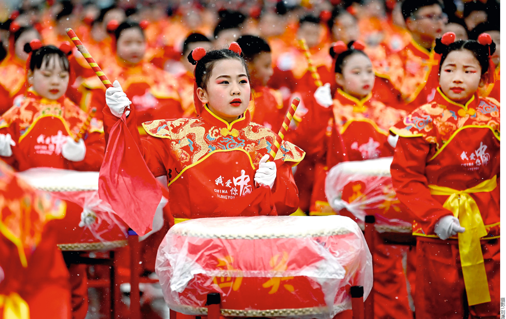 2024 年 2 月 22 日,正在表演的陇县百人少儿锣鼓队。中国各地的社火多有相似之处,舞龙舞狮、鼓乐等不可或缺
