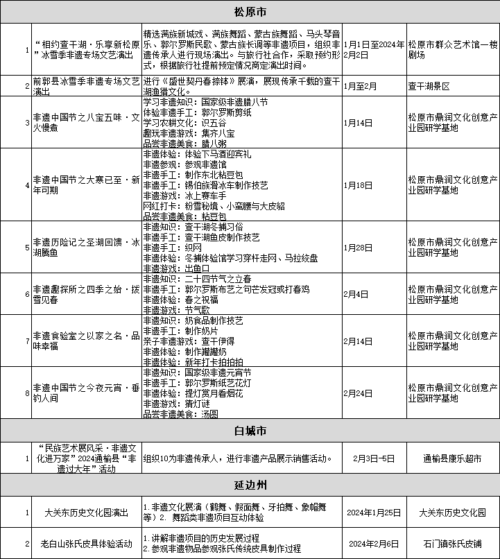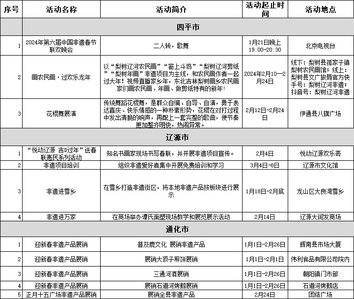 “欢欢喜喜过大年”2024年春节主题文化和旅游系列活动中的“文化进万家 视频直播家乡年”非遗过大年系列活动,将举办“非遗过大年”秧歌展演、“喜乐元宵民族风”元宵节民俗游艺活动等2024吉韵非遗贺新春非遗传承实践活动;开展2024吉韵非遗贺新春市集活动,在商圈、非遗传承体验基地等开展非遗市集,让非遗走进百姓生活。开展“吉林非遗过大年 我的家乡我宣传”网络短视频大赛展播活动,展现非遗过大年“见人见物见生活”的热闹氛围。