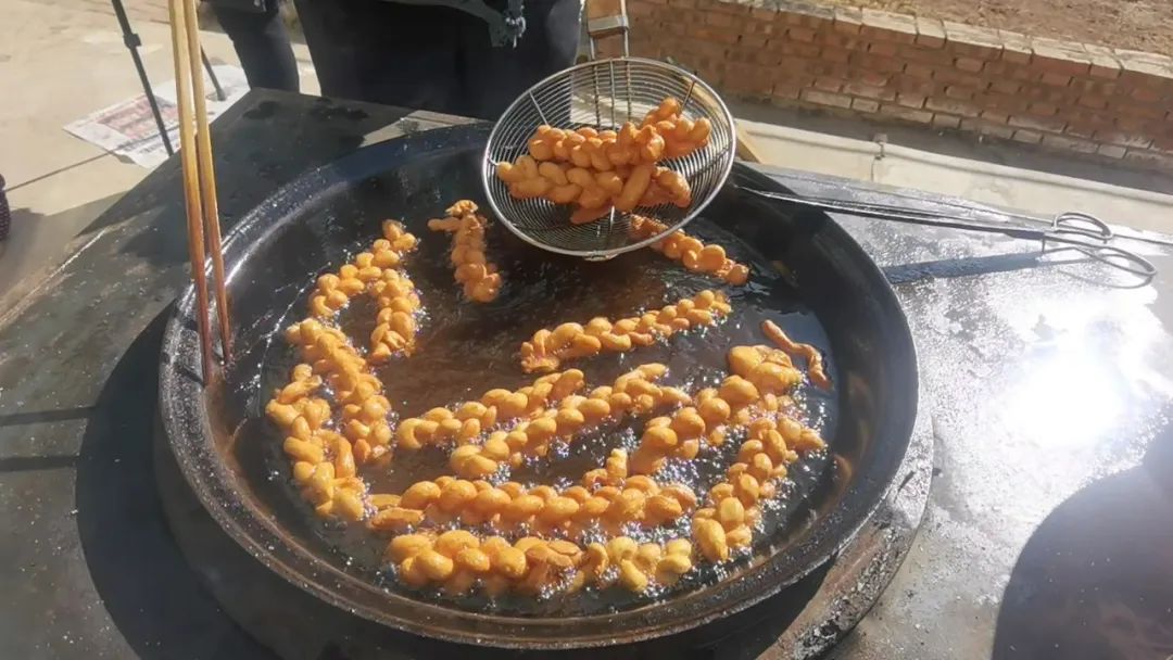 小院里,油锅里扔进铜钱,倒入菜籽油,烧火,油温适当时放入已经辫好的麻花,一边炸,一边轻轻翻动,让麻花均匀受热,不一会,金黄黄的麻花出锅了,浓郁的香味和邻里的笑声相伴,浓浓的年味让农家小院更显温馨。