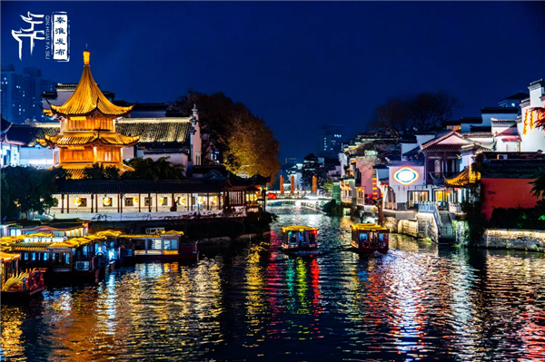 秦淮河波光粼粼,秦淮灯彩摇曳生姿,万盏花灯与古城风韵交相辉映。图片来源:秦淮发布