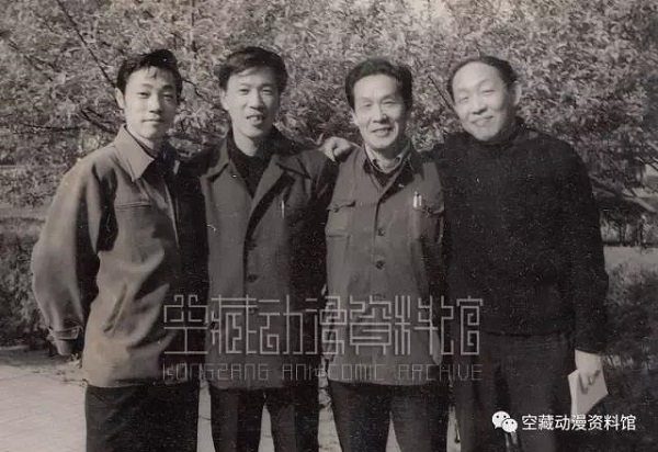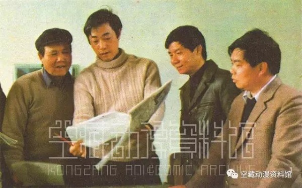 《葫芦兄弟》的主创们在讨论设计稿。左起:葛桂云(A组导演)、胡进庆(总导演)、周克勤(B组导演)、吴云初(造型设计)
