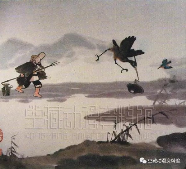 水墨拉毛剪纸片《鹬蚌相争》(1983年) 导演:胡进庆