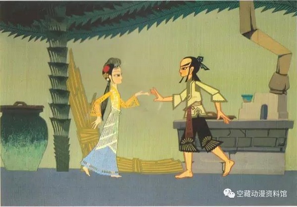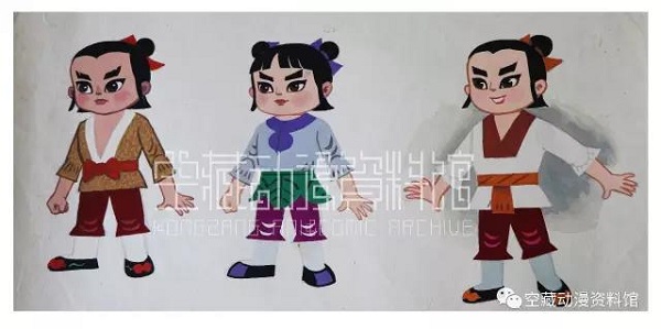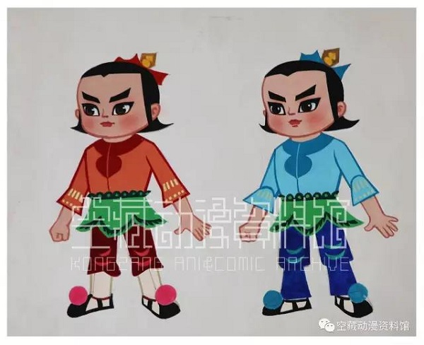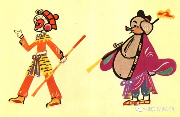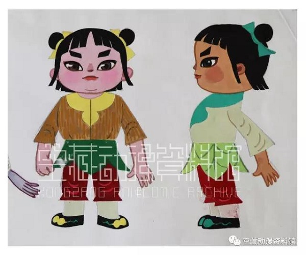 吴云初对胡进庆的想法深感认同,于是欣然同意改变设计思路,决定在胡进庆草图的基础上完善造型定稿。他们做了一个大胆的决定——让影片的造型向单线平涂的赛璐璐风格靠拢,在服装和纹饰上保留必要的装饰元素,并且在上色时强调一些绘画感(这些优势是赛璐璐动画所不具备的)。恰好这个时候厂里有了复印机,用黑线勾勒的纸偶造型就可以批量印证,而人物的动作除了通过操作关节纸偶实现,也可以通过逐张的剪纸动画来表现。这样一番“混搭”后,工作量大大减少,成本也会降低,造型既“耐看”又不会喧宾夺主,更有利于观众把注意力放在在角色表演和剧情上。