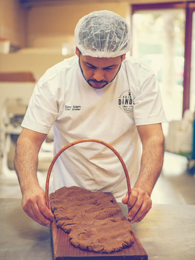 当图瓦饼干店的糕点师正在木质模具上制作人偶形象饼干。