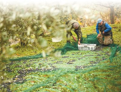 西班牙两名工人正在一处橄榄田中收集采摘的油橄榄。