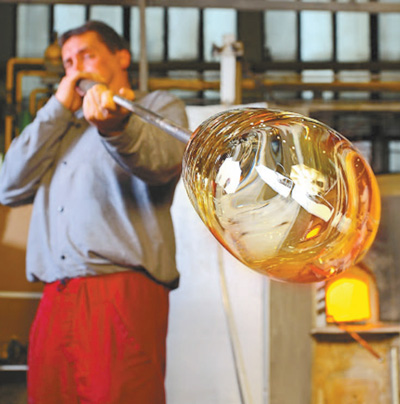 摩瑟水晶工厂内,玻璃工匠正在吹制水晶。