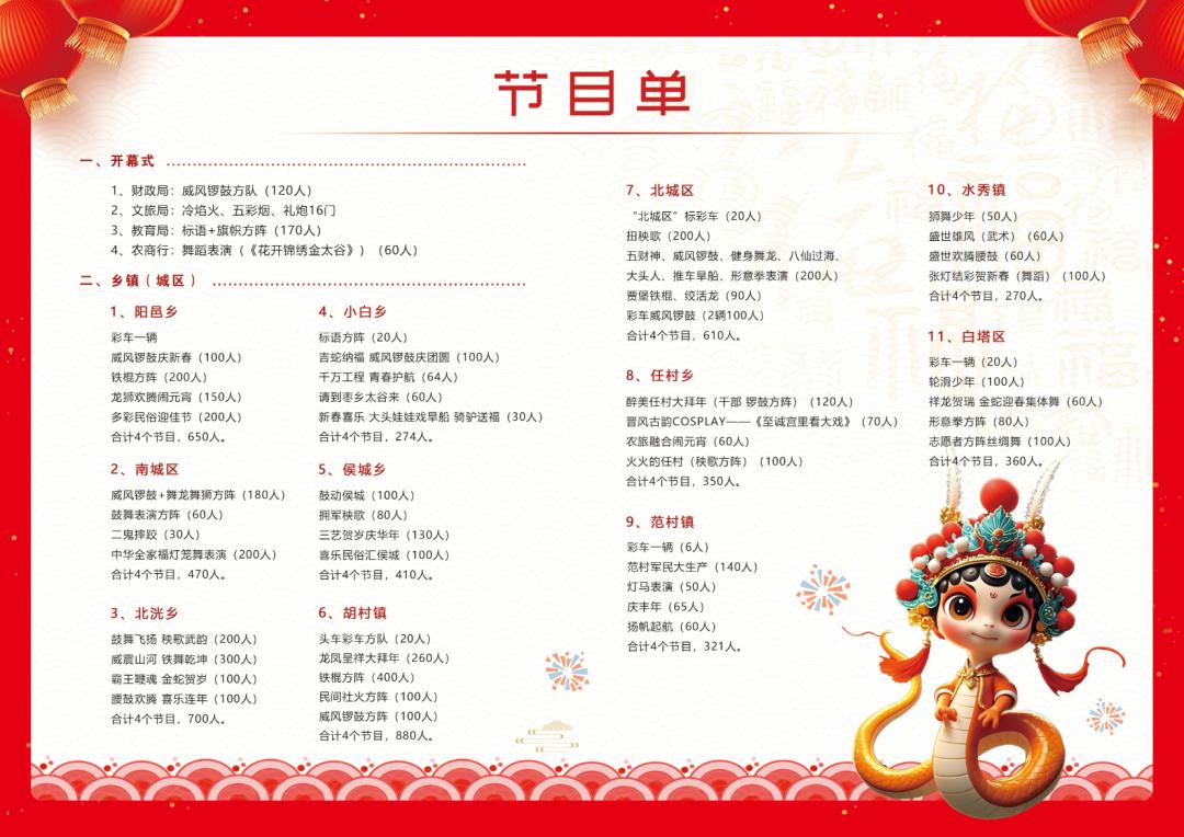 本次活动由11个乡镇(城区)及相关单位参与表演,节目丰富多样,包括威风锣鼓、舞蹈、武术、舞龙舞狮、秧歌等民俗表演,总计48个节目,参演人员5295人。