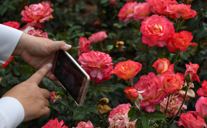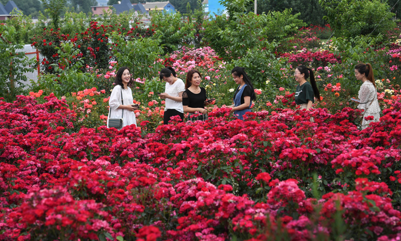 6月17日,游人在玫瑰小镇玫瑰园里观赏盛开的鲜花。