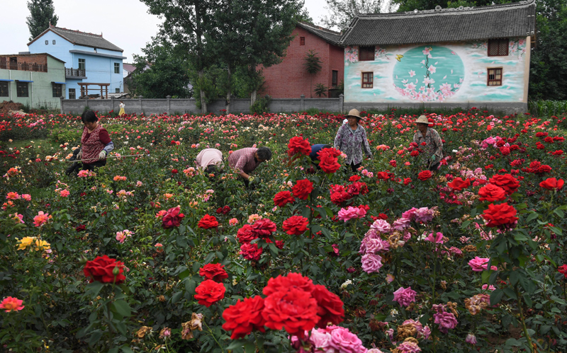 6月17日,村民在玫瑰小镇玫瑰园里除草。小镇每年带动务工群众600余人,乡亲们不用出远门在家门口务工。