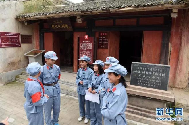 ▲6月18日,几名身穿红军服的小学生在哈达铺镇红军街上的邮政代办所旧址前。新华社记者 马宁 摄