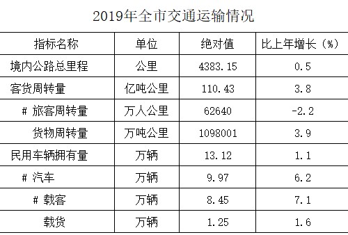 2019年全市年末境内公路总里程4383.15公里,其中国道397.24公里(高速公路243.99公里),省道443.96公里,县道265.13公里,乡道797.52公里,村道2421.22公里,专用公路58.08公里。全市民用车辆拥有量13.12万辆,其中汽车9.97万辆。公路客货周转量110.43亿吨公里,同比增长3.8%。