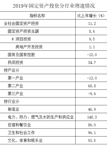 2019年全市全社会固定资产投资同比增长11.2%;其中固定资产投资(不含跨区投资和农户投资)增长8.6%;民间投资增长34.7%。