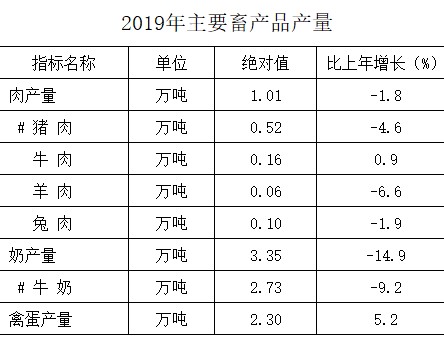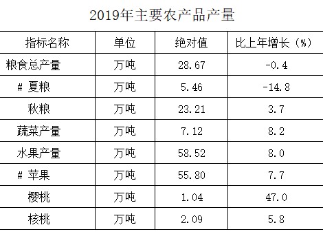 2019年我市农业农村经济呈稳中向好发展态势,完成农林牧渔业增加值27.94亿元,比上年增长4.5%。全年实现粮食总产28.67万吨,下降0.4%;其中夏粮5.46万吨,下降14.8%,秋粮23.21万吨,增长3.7%。园林水果总产58.52万吨,增长8.0%;其中苹果55.80万吨,增长7.7%。蔬菜及食用菌面积3.61万亩、产量7.12万吨,分别增长3.2%和8.2%。肉类总产1.01万吨,下降1.8%。奶类产量3.35万吨,下降14.9%。禽蛋2.30万吨,增长5.2%。