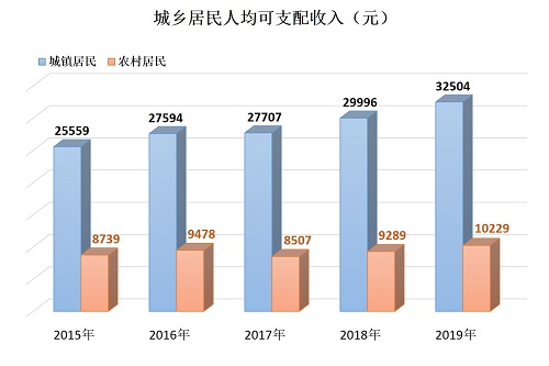 2019年全市全体居民人均可支配收入23897元,同比增长9.0%。其中城镇常住居民人均可支配收入32504元,增长8.4%;农村常住居民人均可支配收入10229元,增长10.1%。