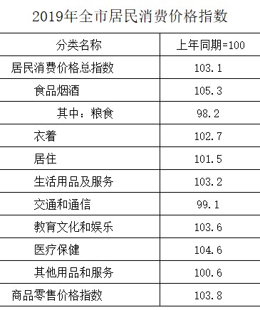 2019年全市居民消费价格上涨3.1%,涨幅比上年提高0.7个百分点。八大类消费价格指数“七涨一降”,其中食品烟酒涨5.3%、衣着涨2.7%、居住涨1.5%、生活用品及服务涨3.2%、教育文化和娱乐涨3.6%、医疗保健涨4.6%、其他用品和服务涨0.6%,交通和通信降0.9%。工业生产者出厂价格上涨0.8%,比上年回落3.6个百分点;工业生产者购进价格上涨1.5%,回落1.0个百分点。
