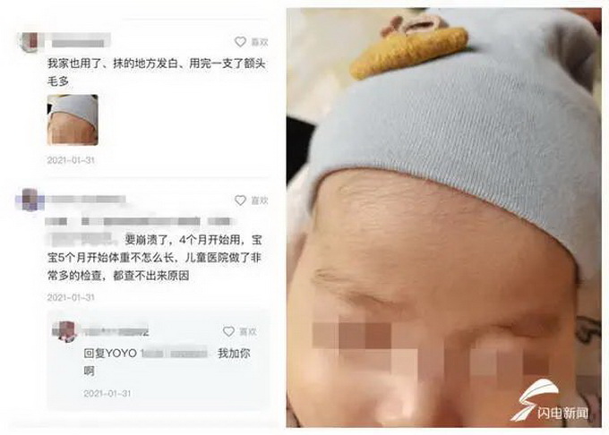 另外一位宝妈则表示自己家孩子现在五个多月,在月子里用了涉事抑菌膏,出月子时宝宝的身高只长了一厘米,脸也非常胖,额头有汗毛。后来停用后汗毛才开始退,但是现在宝宝身高仍然增长不明显。