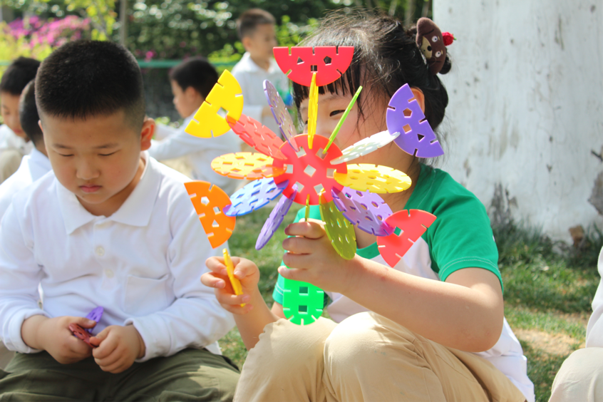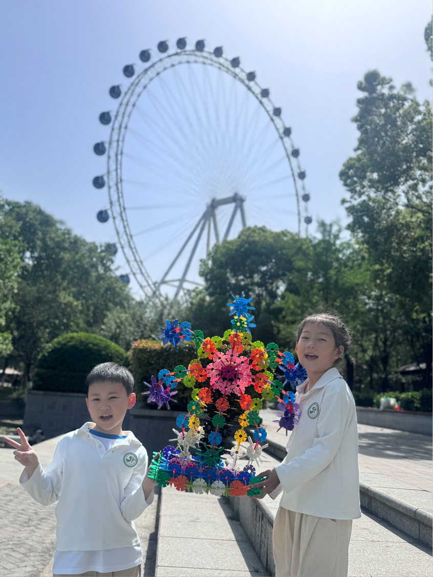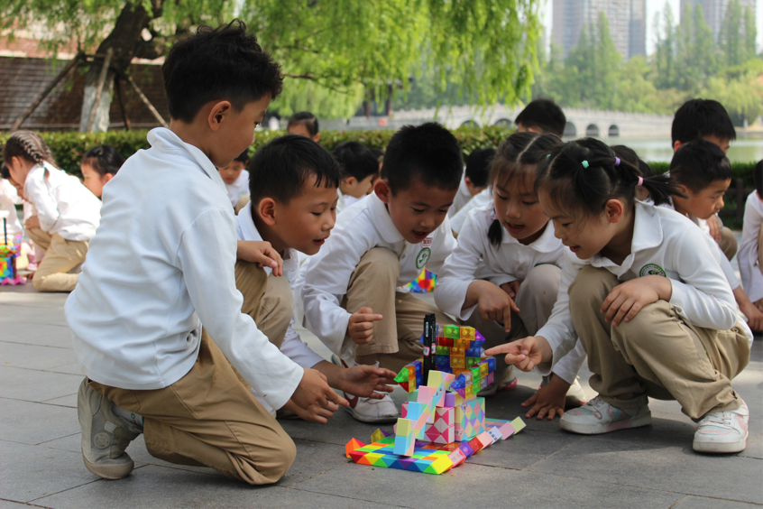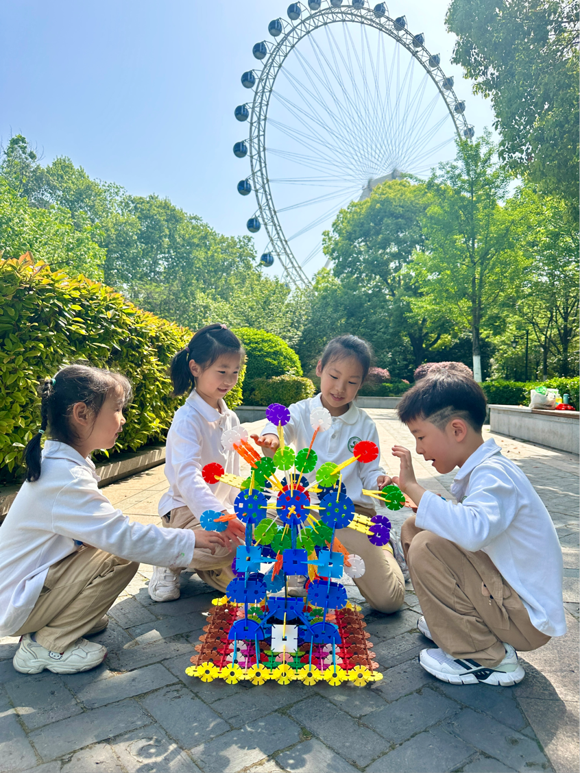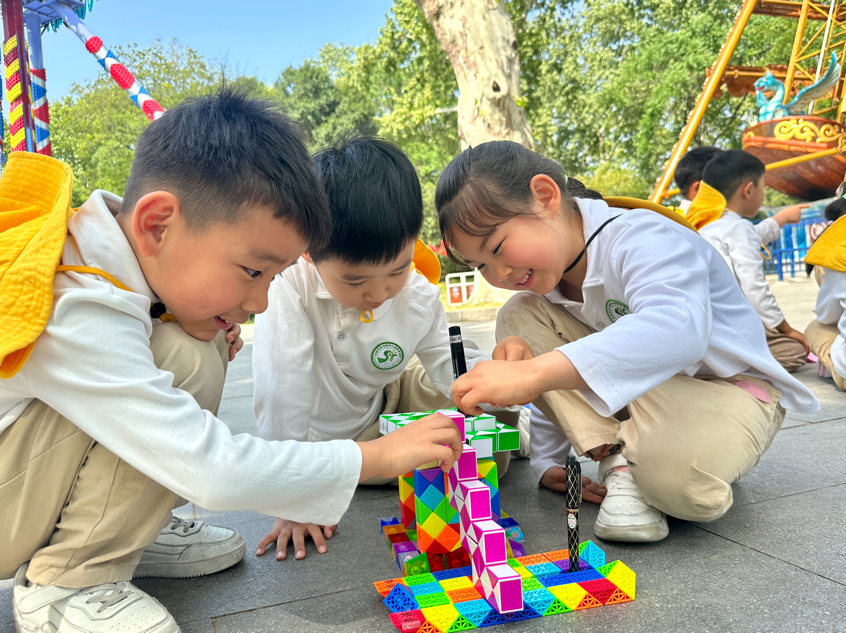 翠盖轻摇遮日影,清风徐来送凉馨。公园里处处有故事、步步有回忆。在科普探索环节,孩子们通过拼插雪花片、玩转魔尺,将数学概念、空间思维与历史想象融合。当微型摩天轮与战船模型在公园草坪上“落地”,传统文化与现代教育的碰撞迸发出别样火花。