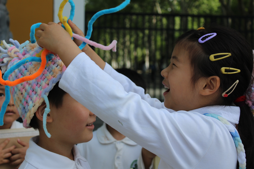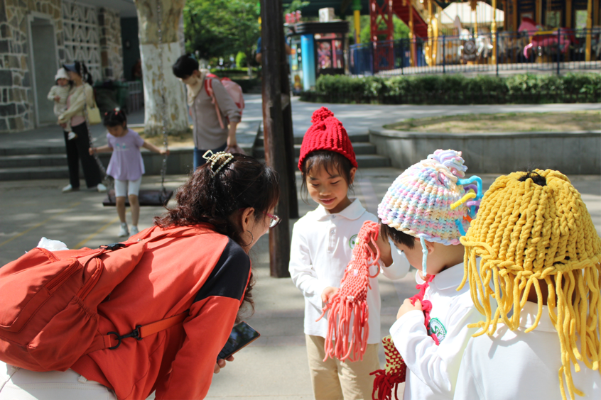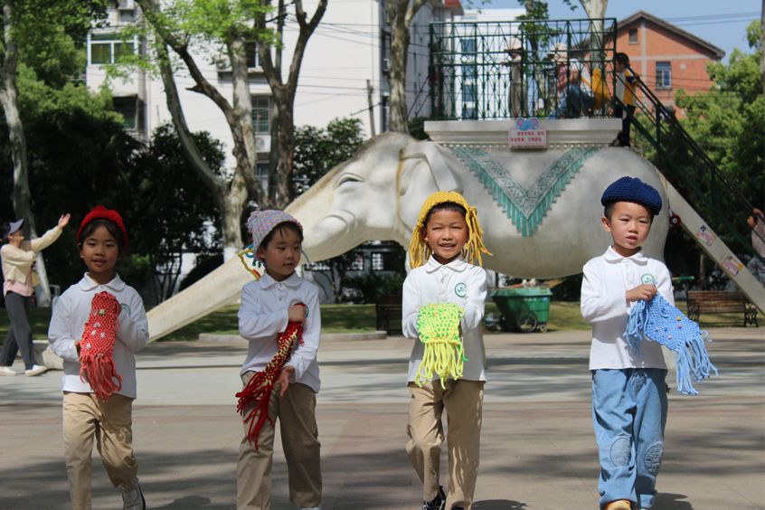“走走走,我们一起去逍遥津”, 怀揣着愉快的心情,老师和孩子们策划了一场走读老城——逍遥津快闪打卡活动,踏着轻盈的步伐,唱着春天的歌,开启了一场与春天的约定。位于逍遥津公园的大象滑滑梯,承载着几代合肥人的童年记忆,是合肥地标性“童趣符号”。小朋友们将非遗将传统手工艺与大象滑梯展示完美结合,为温润的逍遥津春日增添了一抹温馨的色彩。通过一年特色课程的开展,孩子们在老师的指导下,认真学习了编织围巾、帽子的基本技巧,亲手编织出了一条条色彩斑斓、各具特色的作品。活动中,孩子们身着自己亲手编织的作品,或为包包、或为日常用品,五彩斑斓,充满了童真与创意。他们自信地走在大象滑梯旁的T台上,展示着自己的作品,赢得了现场观众的阵阵掌声。