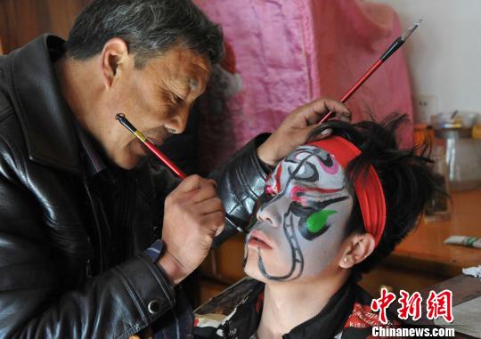 每年正月,甘肃清水乡村“转”起“马社火”,为来年祈福。图为化妆。 杨兆康 摄