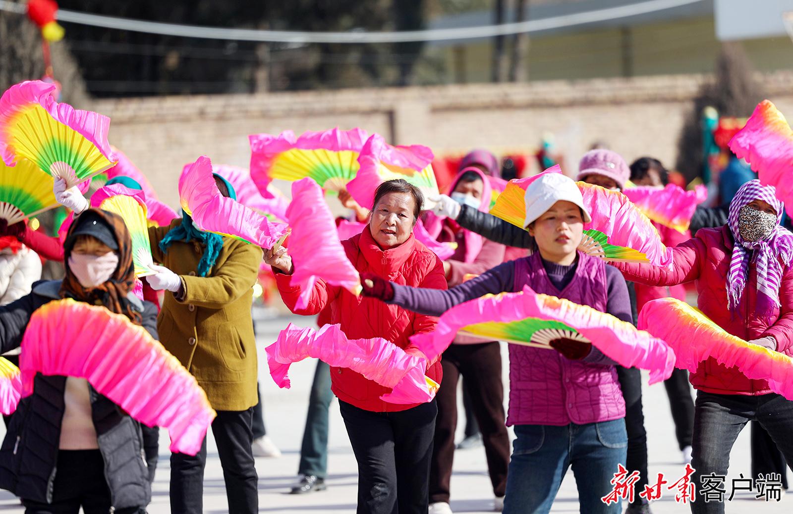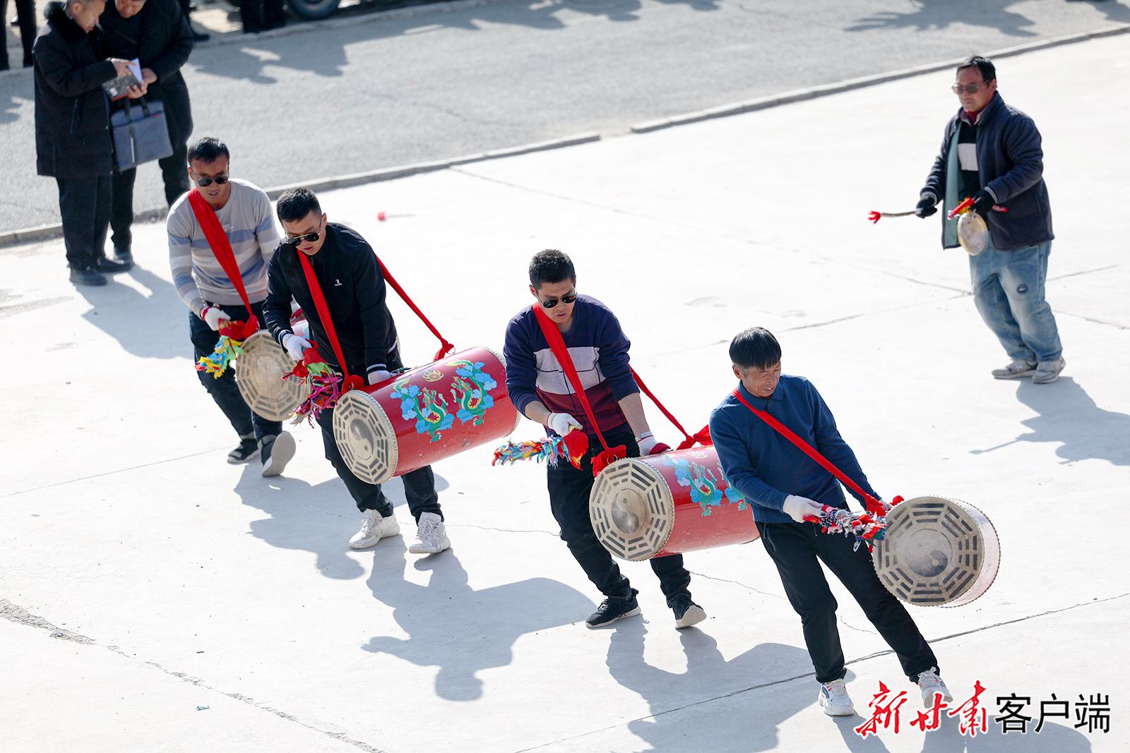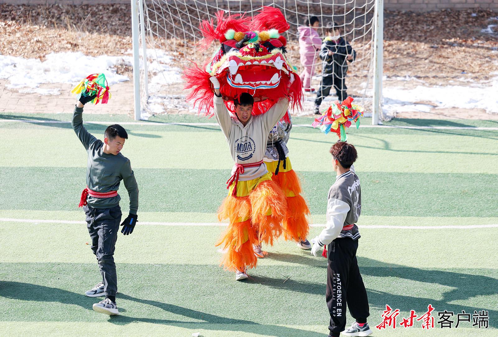 1月27日,在榆中县小康营乡红寺村村委会广场上,太平鼓、舞龙、舞狮、划旱船等传统社火节目正在彩排中,准备迎接新春佳节的到来。