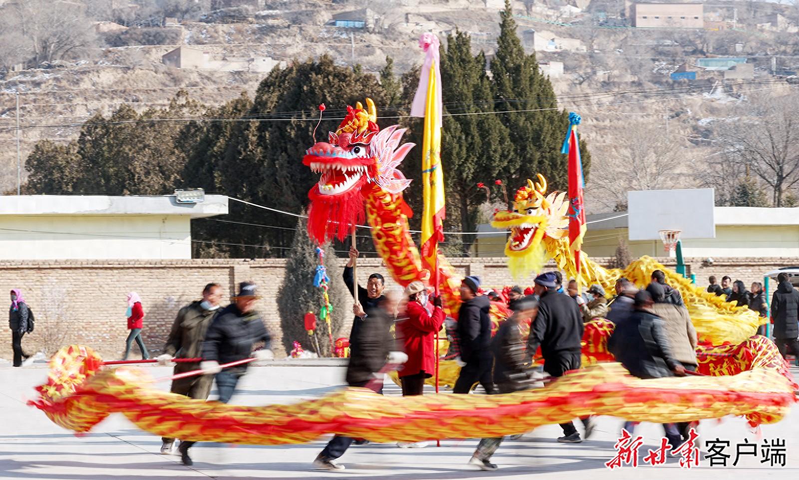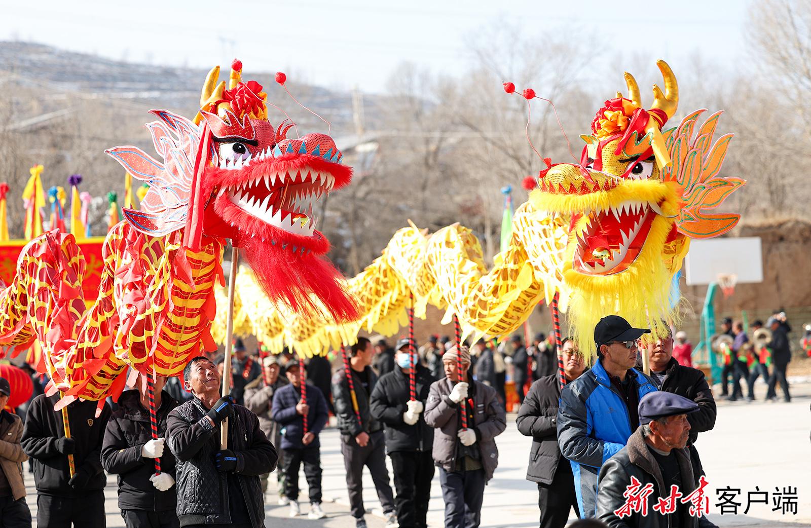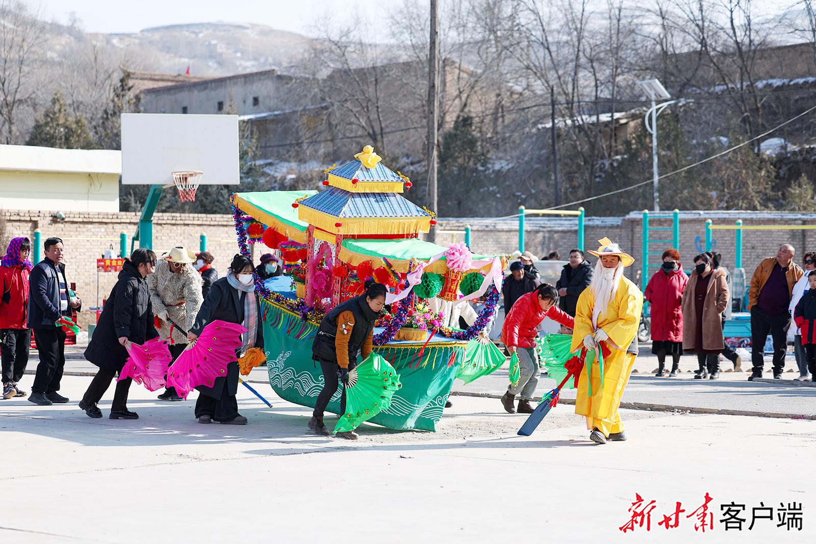 1月27日,在榆中县小康营乡红寺村村委会广场上,太平鼓、舞龙、舞狮、划旱船等传统社火节目正在彩排中,准备迎接新春佳节的到来。