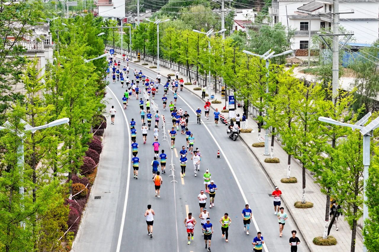 赛道全程犹如一条蜿蜒的生态长廊,串联起金台山文化旅游区的唐风古韵、云盖寺古镇的青石板街,以及沿途的田园村落。“简直像是跑进水墨画里!”来自甘肃的跑者何永峰边跑边感叹:“转过一个弯就是一片花海,沁人心脾。”为打造沉浸式体验,赛道沿途完成35组立体花艺布景,并融入了智慧交通标识改造。