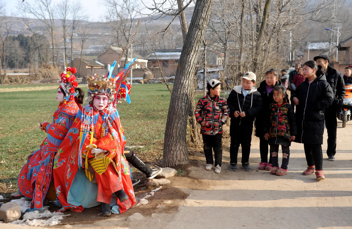 在转往其它村子途中,马鹏手持的“金元宝”不小心掉在了地上,引起几位同行伙伴的大笑。“今天要走大约4个村子,其中有两个村子都是大村,每个都有四五百户人家。”马鹏介绍。昨天他们社火队从上午出去,一直到下午6点才回到家,全天都是不停地走路,一天下来还是挺累的。