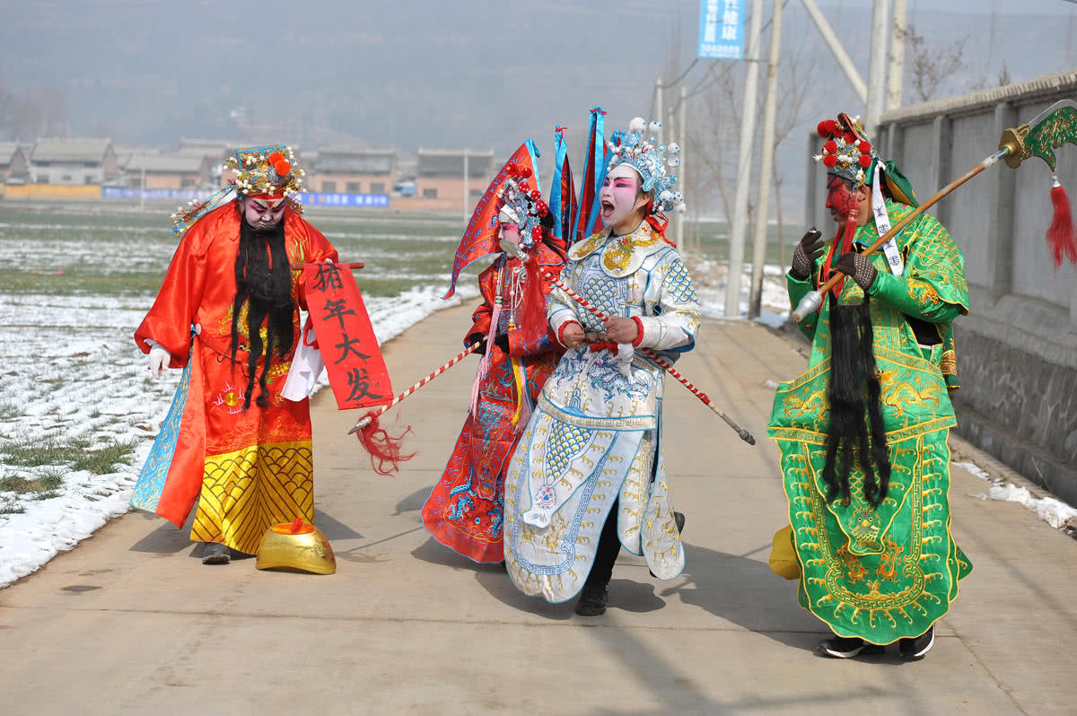 梨林川村社火队扮演的有黑虎、灵官、财神、关公、穆桂英等等,这也是陇县社火中最常见的人物。他们都取材于神话、历史演义、民间传说故事,寄托着人们降妖驱魔、辟邪镇宅、安泰吉祥、祈福求祥的美好愿望和期盼。图为所有人都准备妥当后,乐队敲响锣鼓,社火队在村委会前巡游一圈后开始前往邻村。