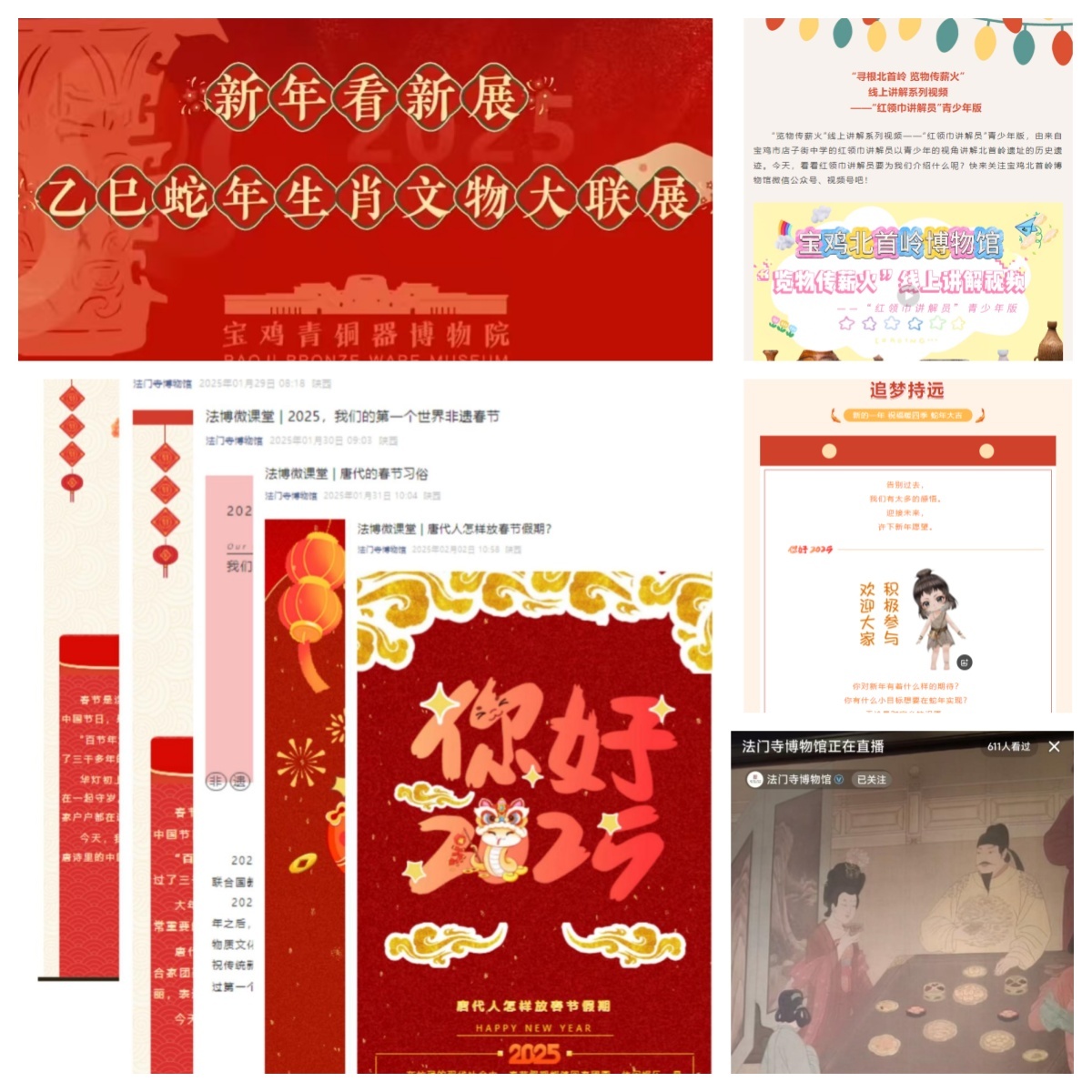 云上平台精彩呈。宝鸡青铜器博物院、宝鸡先秦陵园博物馆、宝鸡周原博物院、扶风县博物馆、陈仓区博物馆、陇县博物馆等10多家博物馆在官微公众号、视频号推出云展览、云课堂、云直播等100多场次,打破空间界限,扩大展览覆盖面,加强文化交流和传播。法门寺博物馆推出“法博微课堂”系列推文5期,活动系列推文7期(公众号、视频号、抖音、小红书、微博等多平台推送),近3万人次关注。北首岭博物馆小北讲年俗、览物传薪火线上展览、追梦持远线上互动活动线上浏览量3000多人次。宝鸡青铜器博物院从大年初一至初三,连续推出《博物馆里过大年》《春满三秦 巳巳顺遂》《来宝鸡青铜器博物院赴一场蛇年生肖奇妙之旅》三期精彩直播,让无法亲临现场的观众也能“云游”博物馆,感受浓浓的节日氛围。