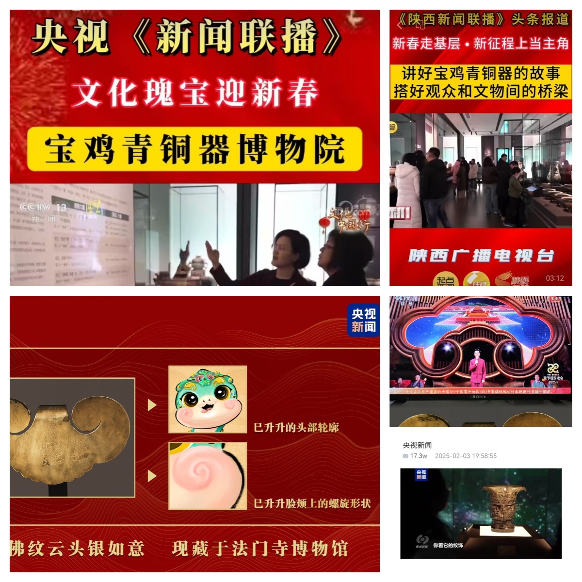 媒体聚焦亮点多。央视春晚吉祥物及春晚舞台造型均取自法门寺博物馆馆藏文物“鎏金坐佛纹云头银如意”元素设计。宝鸡青铜器博物院基本陈列提升改造——《青铜铸文明》焕新开展吸引了中新网、凤凰网、陕西日报等媒体的宣传报道。宝鸡青铜器博物院亮相央视《新闻联播》,文化瑰宝迎新春报道了宝鸡青铜器博物院“青铜铸文明”陈列展览。2月3日,《焦点访谈》播出“足迹:文脉赓续 继往开来”节目,介绍了何尊,讲述了宝鸡青铜器博物院为传承和弘扬中华文明所做的工作。1月31日《陕西新闻联播》以“讲好宝鸡青铜器的故事 搭好观众和文物间的桥梁”为主题进行了报道,具体介绍了宝鸡青铜器在文化传承等方面的意义和价值等内容。