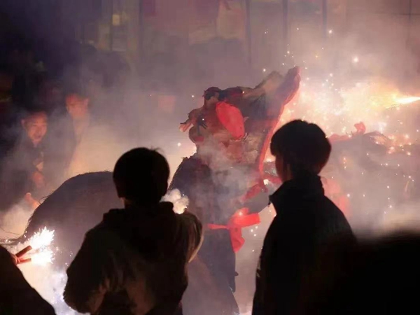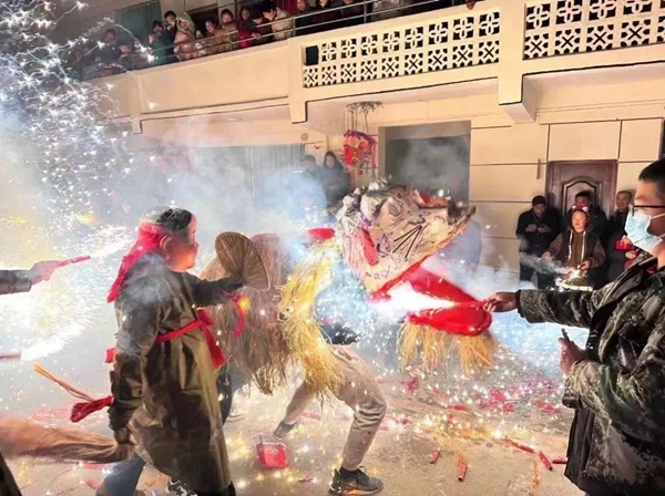 活动现场,来自四面八方的群众相聚在这里观看社火表演,现场汇聚成一片欢乐的海洋。火狮子伴随着激越的锣鼓声不断飞跃,舞动翻腾。当地群众用火筒进行燃放,喷薄四溅的火花,绚烂多姿,令人眼花缭乱,火狮子在火筒的逗引下,在人群中蜿蜒舞动、腾挪躲闪、上下翻滚,场面十分壮观。“彩龙船”左右挥舞摆动,或飞旋起舞,或踏歌翩跹进退,此起彼伏,热闹非凡。浓浓的年味扑面而来。
