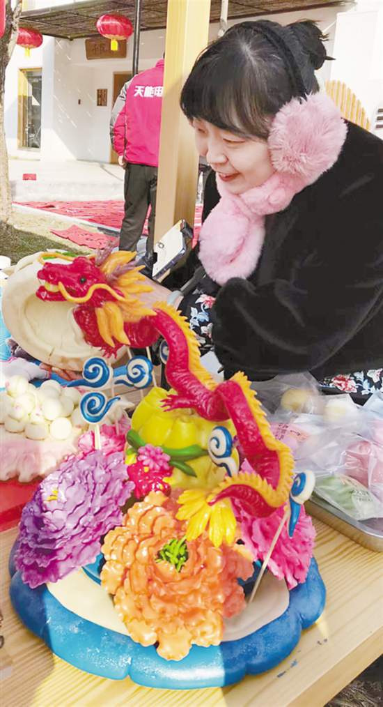 西安“如意面花”非遗团队成员介绍面花作品《巨龙腾飞》。 记者 张军朝摄