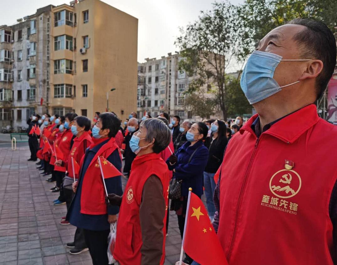 10月1日,同济里社区举行升国旗仪式,社区干部、“访惠聚”工作队员、居民志愿者参加升国旗仪式。居民王鑫酩说:“每年国庆节,我都会准时参加社区的升国旗仪式,在这一刻,我非常自豪。我们的国家久经磨难,但是一次次战胜了困难。我相信在党的领导下,我们老百姓的生活一定会越来越好,一定会战胜疫情摘下口罩,在阳光下尽情展现笑脸。”