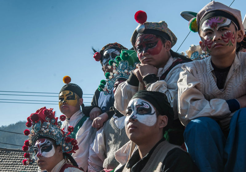 2月11日,正在等待上场的村民在一旁观看他人的表演。