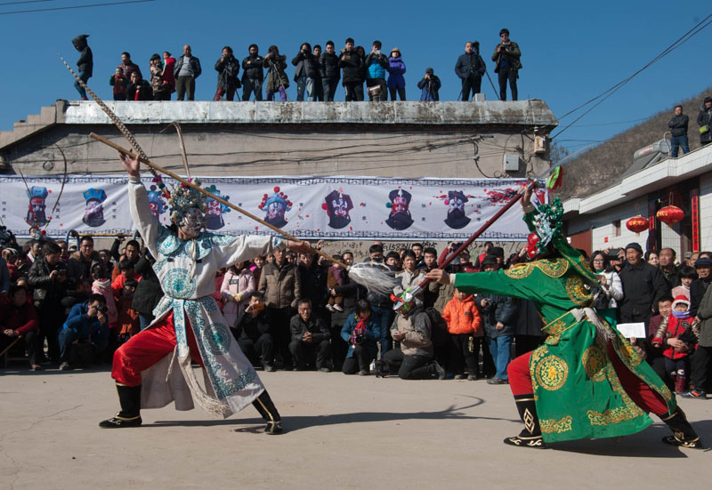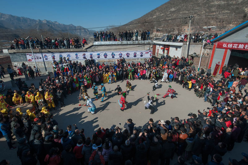 2月11日,石家庄井陉县桃林坪村,一年一度的桃林坪花脸社火在村子中心上演,画成花脸的村民在观众的层层围观下“大打出手”,场面十分热闹。