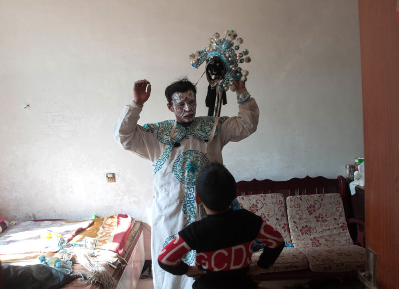 2月11日,在花脸社火中扮演吕布的许中华疲惫归家,他的儿子好奇地观看爸爸怎么卸妆。
