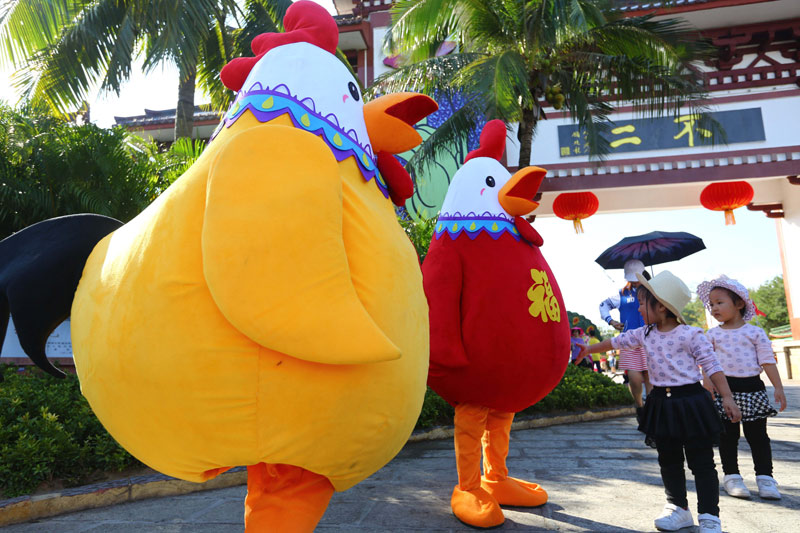 1月30日,在海南省三亚市南山文化旅游区新春庙会上,小朋友被卡通鸡人偶吸引。