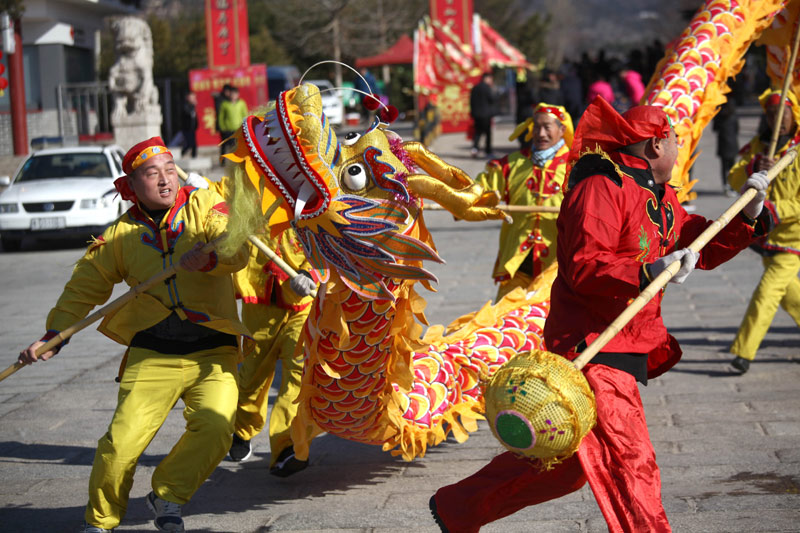 1月30日,民间艺人在山东省临沂市蒙山龟蒙旅游景区举办的春节祈福庙会上进行舞龙表演。