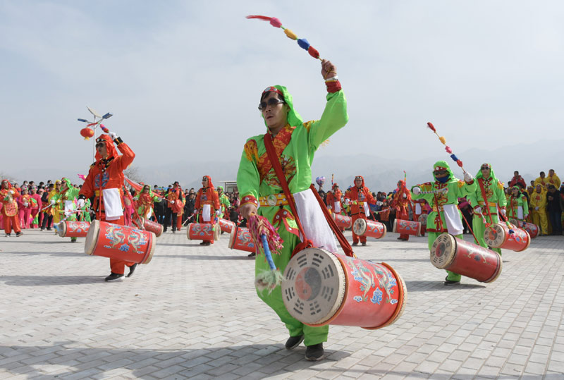 1月30日,在甘肃省永靖县盐锅峡镇乡村庙会上,村民们表演民俗节目“太平鼓”。
