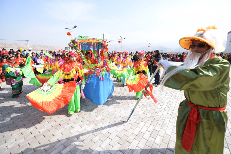 1月30日,在甘肃省永靖县盐锅峡镇乡村庙会上,村民们表演民俗节目“划旱船”。