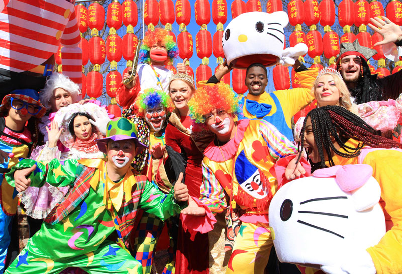 1月30日,外国演员在北京石景山游乐园“洋庙会”上进行巡游表演。