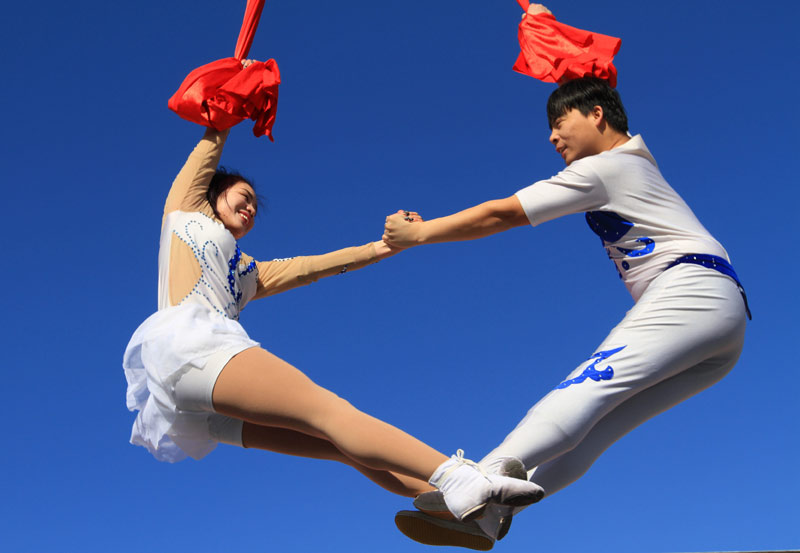 1月30日,两位演员在山东省临沂市沂南县竹泉村新春庙会上表演高空绸吊。