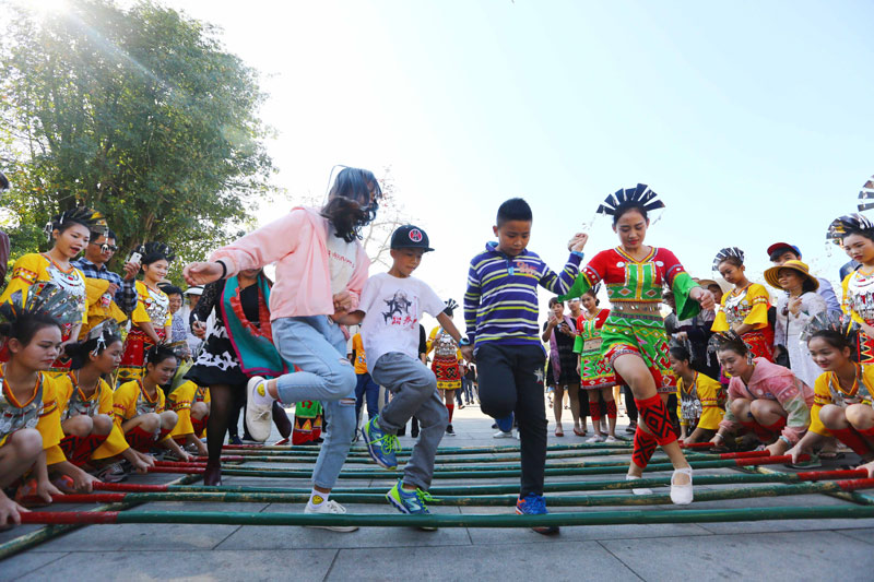1月30日,在海南省三亚市南山文化旅游区新春庙会上,演员和游人跳起海南黎族竹竿舞。