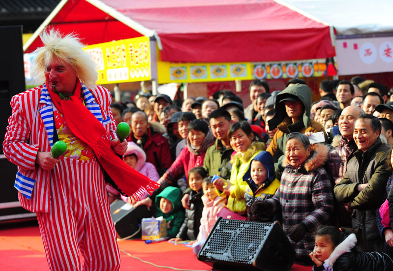 1月30日,在江苏省无锡市南禅寺新春庙会上,一位外国小丑演员在表演。